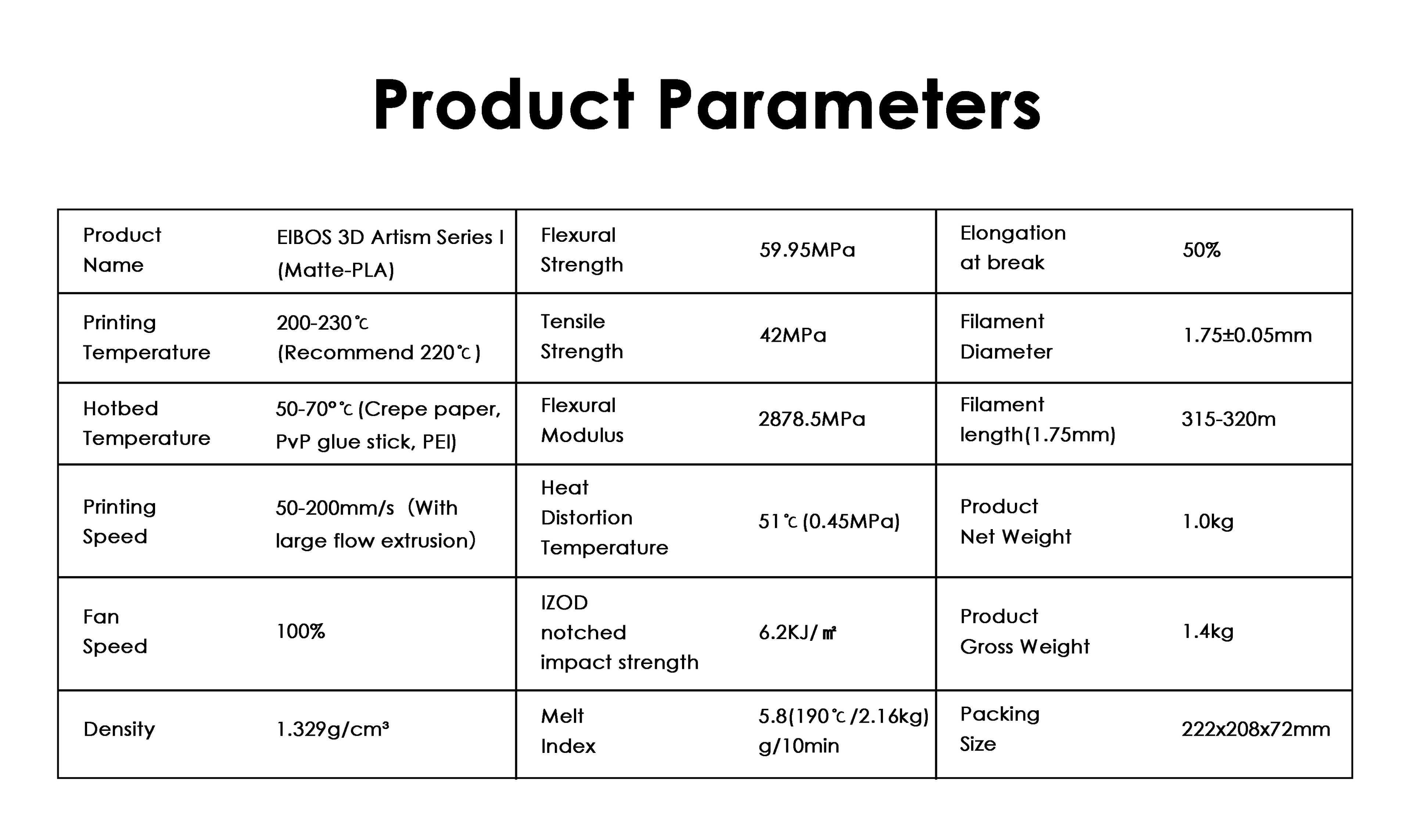 Das EIBOS Filament Artism Series I bietet mit seiner optimierten Formel, die einen gleichmäßigen und konsistenten Filamentfluss bietet, eine hervorragende Druckqualität. Dies gewährleistet scharfe Details und präzise Schichthaftung, was zu Drucken mit minimaler Verformung oder Defekten führt. Die matte Oberfläche fügt eine einzigartige Textur hinzu, die die Sichtbarkeit von Drucklinien verringert und Ihren Kreationen ein raffiniertes, professionelles Aussehen verleiht. Dieses Filament ist ideal für hochwertige Modelle, Prototypen und künstlerische Projekte und verleiht jedem Druck ein poliertes und makelloses Finish.