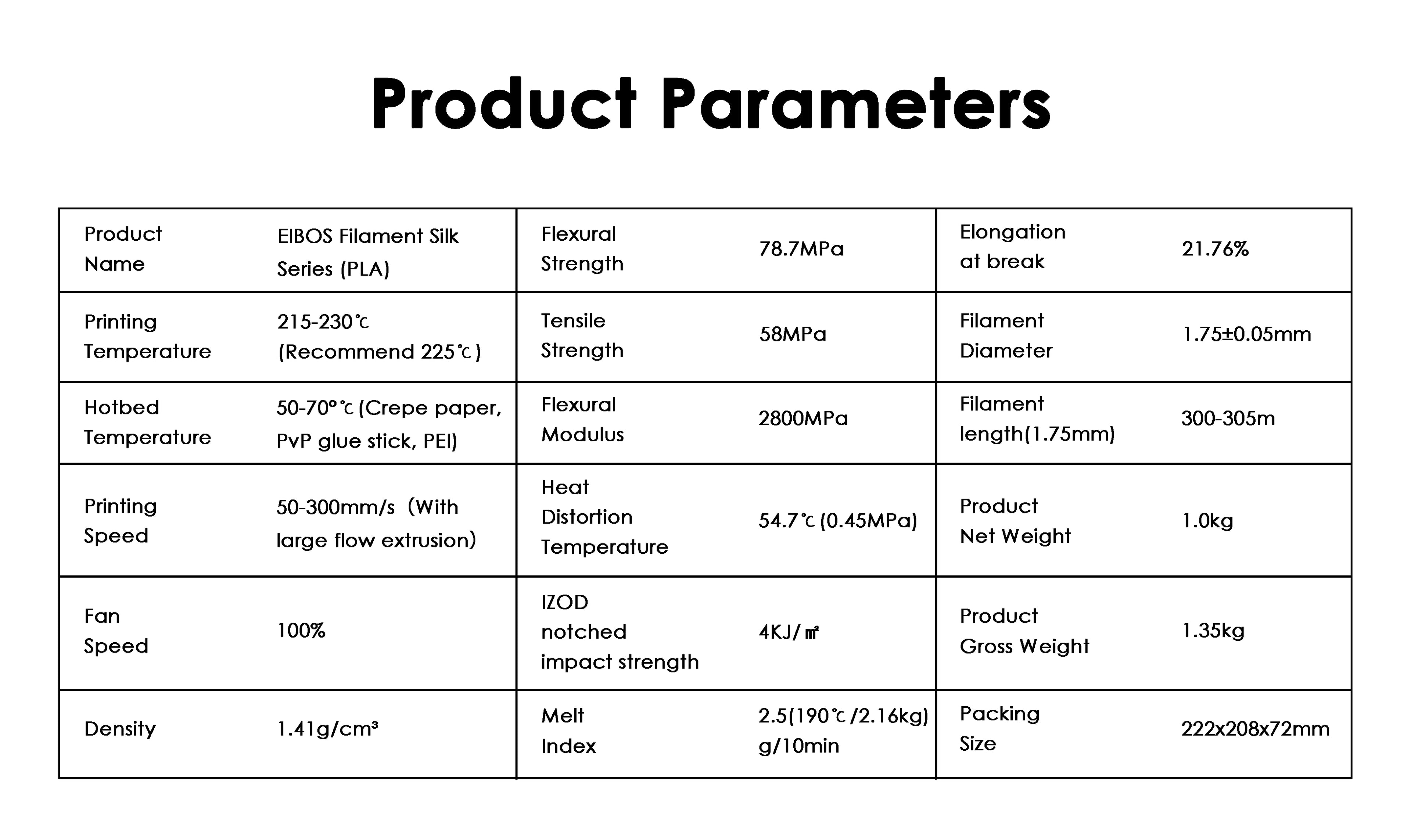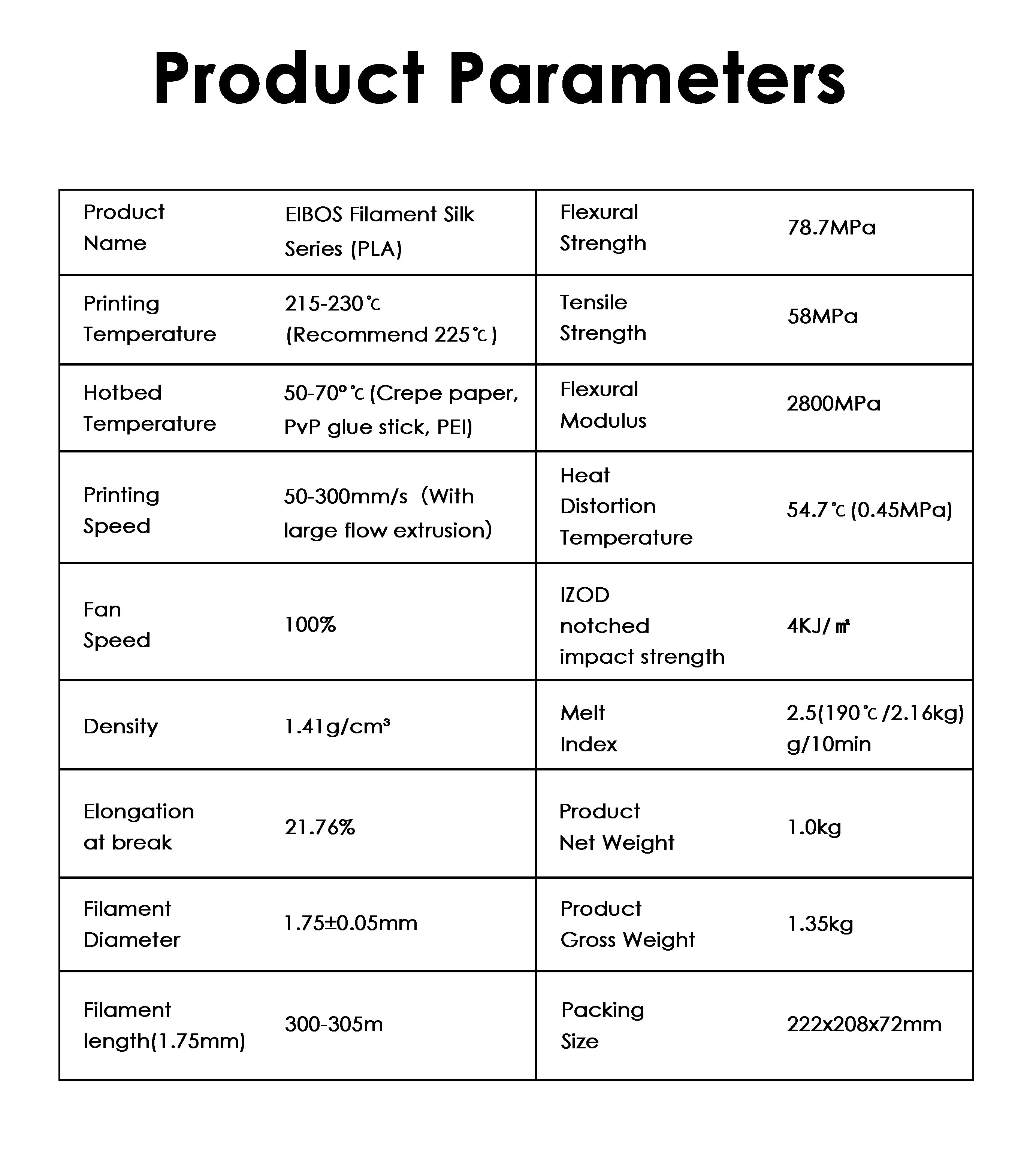 Tauchen Sie ein in eine Welt künstlerischer Möglichkeiten mit dem 3D-Druckfilament der Silk-Serie. Erwecken Sie Ihre kreativen Visionen zum Leben und erstellen Sie atemberaubende, schimmernde Objekte, die Eleganz und Raffinesse ausstrahlen. Egal, ob Sie Künstler oder Schöpfer sind, die seidig glatte Oberfläche dieses Filaments wird Ihre Drucke auf ein neues Niveau heben und Ihre Ideen in greifbare Kunstwerke verwandeln. Erweitern Sie Ihr 3D-Druckerlebnis mit dem Filament der EIBOS Silk-Serie und lassen Sie sich von der Schönheit und Komplexität Ihrer gedruckten Objekte überraschen.