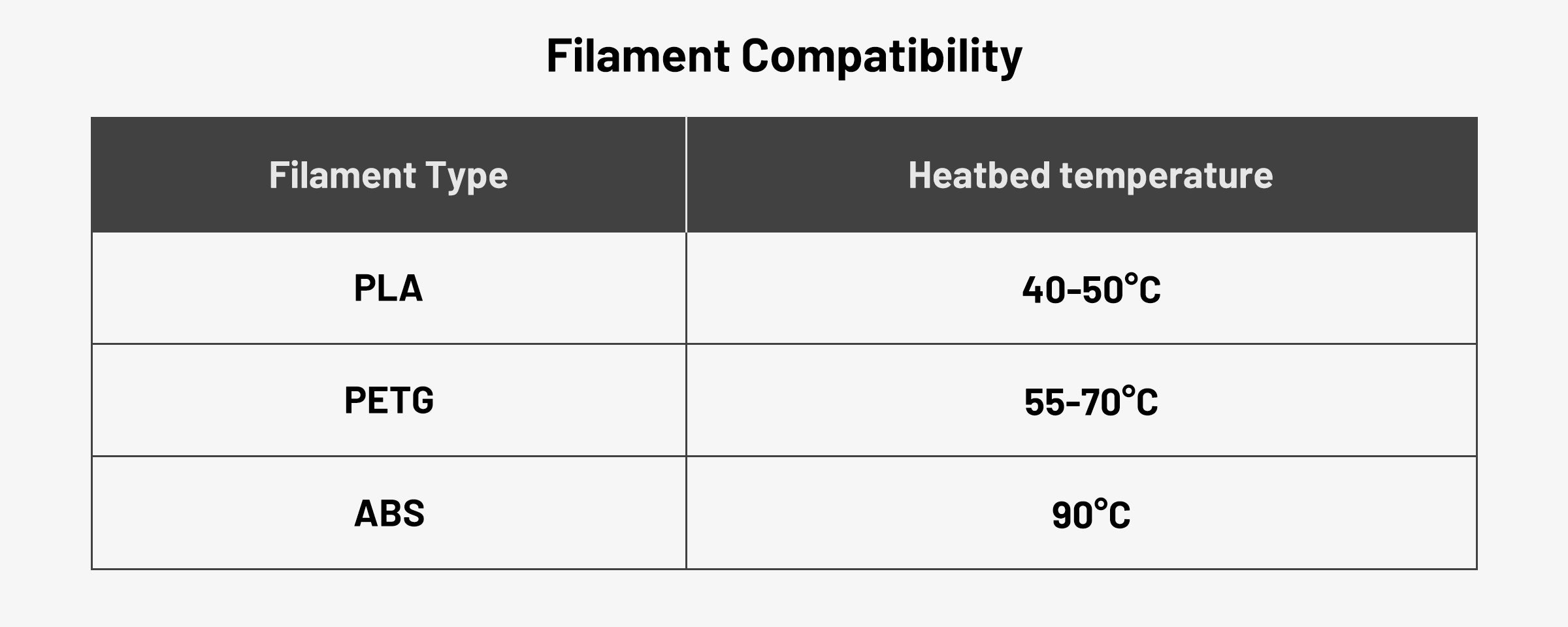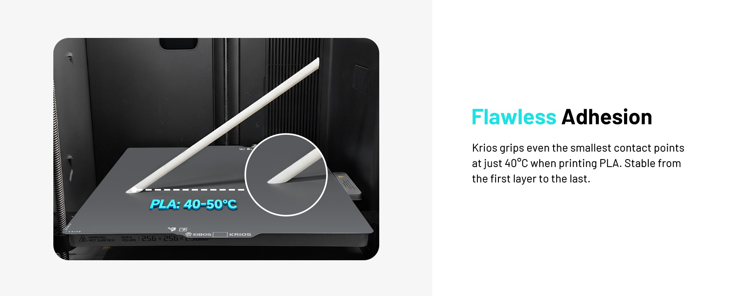 • Strong Adhesion at Lower Temperatures: Grips PLA starting at 40°C and PETG at 55°C without glue.