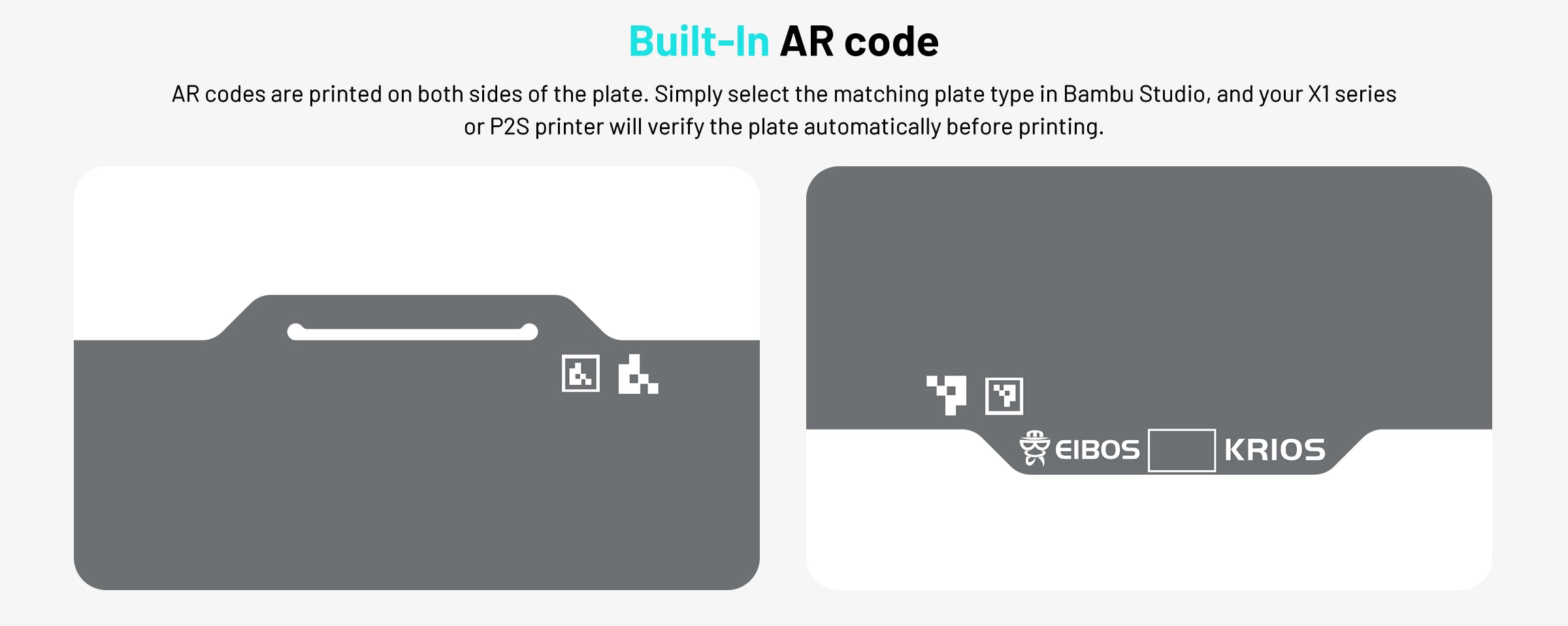 • Built-in AR code: AR codes are printed on both sides of the plate. Simply select the matching plate type in Bambu Studio, and your X1 series or P2S printer will verify the plate automatically before printing.