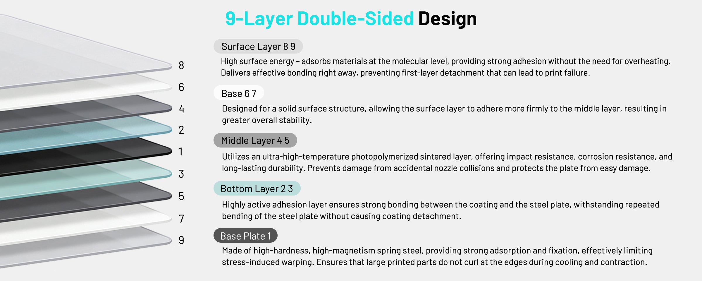 • 9-Layer Double-Sided Structure: High-hardness, high-magnetism spring steel base with a special coating formula. Microporous surface layer bonds with materials without overheating. Impact-resistant middle layers protect against accidental nozzle collisions.